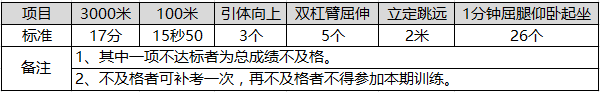 根据民航局要求,男生在取得安全员执照前须参加民航局组织的安全员初始训练考核,体能考核项目及标准为: